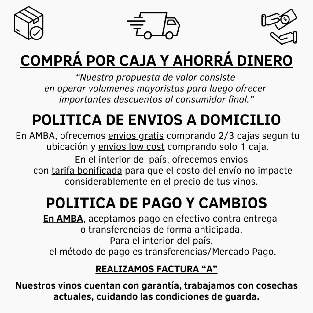 Para pedidos al interior del país ofrecemos tarifas bonificadas, para que el costo del envío tenga baja incidencia en el precio de tus vinos. Cubrimos aproximadamente el 50% del valor del envio.